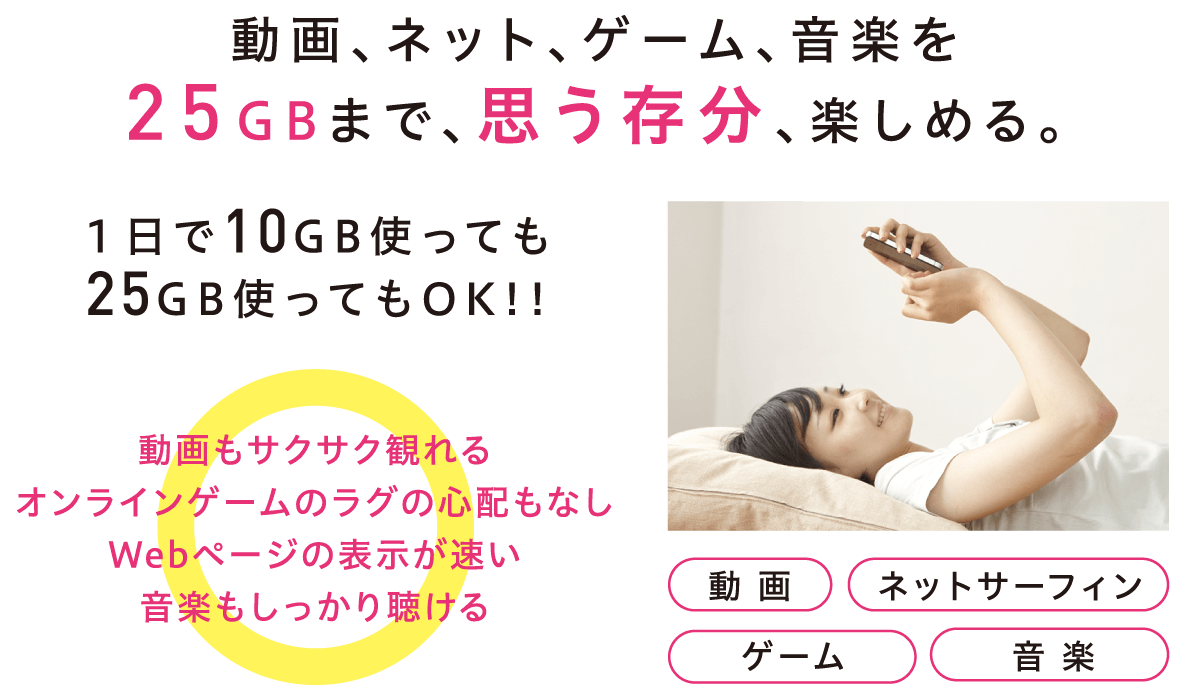 通信容量25GBまで制限なし※1で、動画やネット、ゲームや音楽などをご利用いただけます。
